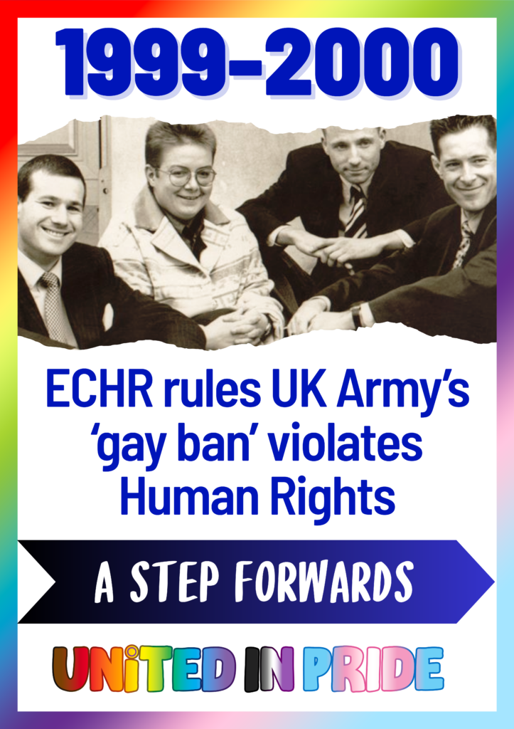 1999 to 2000 ECHR rules UK Army’s ‘gay ban’ violates Human Rights. In 1999 and 2000, a series of landmark