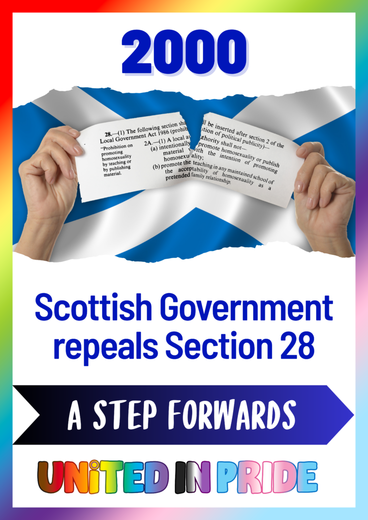 2000 Scottish Government repeals Section 28. In 2000, the newly established Scottish Parliament made the historic decision to repeal Section 28 (known as Section