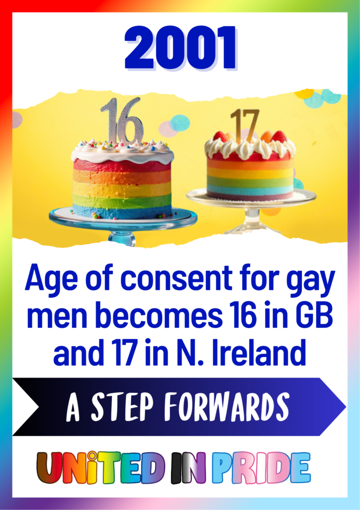 2001 Age of Consent becomes 16 in Great Britain and 17 in Northern Ireland. In 2001, the age of consent