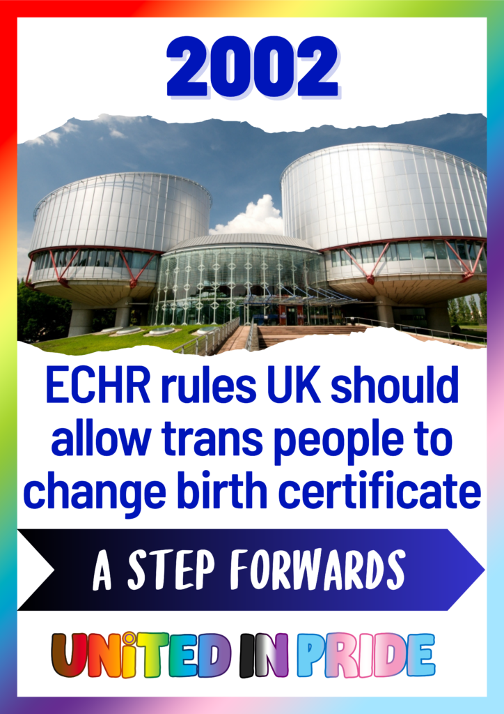 2002 ECHR rules UK should allow trans people to change birth certificate. In 2002, the European Court of Human Rights
