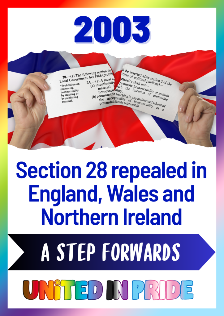 2003 Section 28 repealed in England Wales and Northern Ireland. Section 28 of the Local Government Act 1988, which prohibited