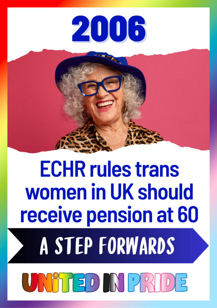 2006 EU rules trans women should receive their pension in the UK. In 2006, a landmark ruling by the European Court