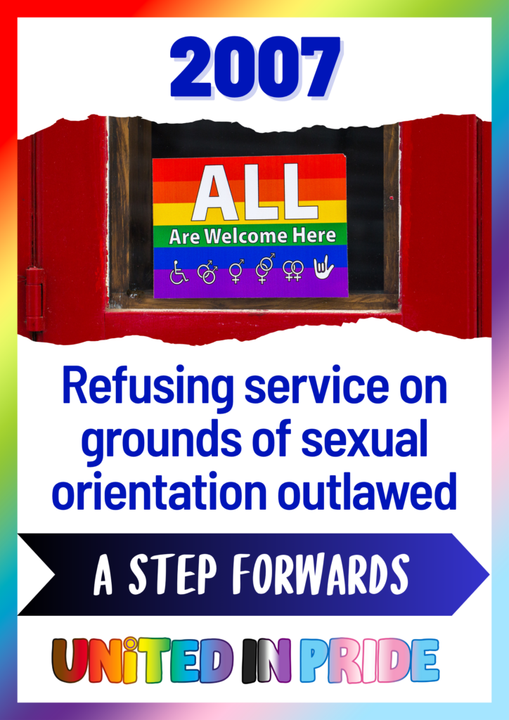 2007 Refusing service on grounds of sexual orientation outlawed. The Equality Act (Sexual Orientation) Regulations 2007 (SI 2007/1263) were landmark secondary regulations
