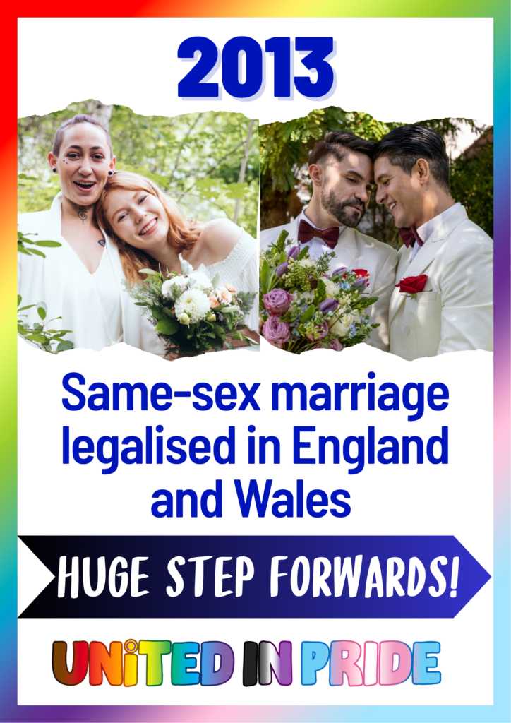 2013 Same sex marriage legalised in England and Wales. The legalisation of same-sex marriage in England and Wales was achieved through