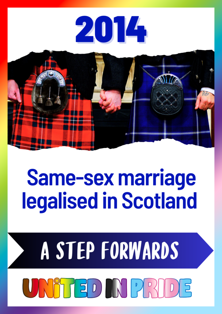2014 Same Sex Marriage Legalised In Scotland Same-sex marriage became legal in Scotland in 2014 through the Marriage and Civil Partnership (Scotland)