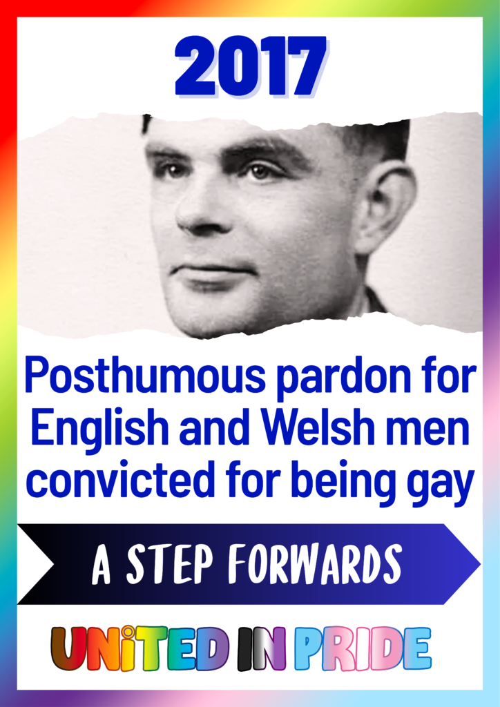 2017 Posthumous pardon for English and Welsh men convicted for being gay. In 2017, the UK government enacted a provision