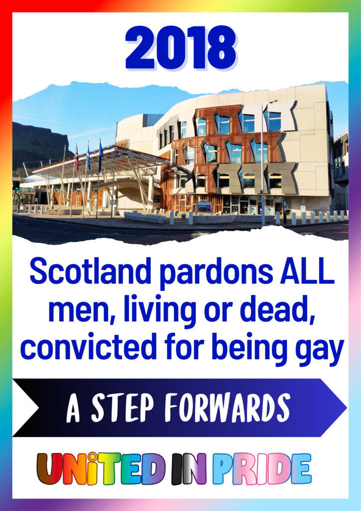 2018 Scotland pardons All men, living and dead convicted for being gay. In 2018, the Scottish Parliament passed the Historical Sexual