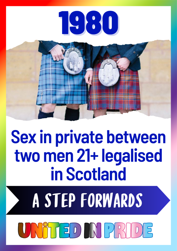 1980, - Sex in private between two men aged 21+ legalised in Scotland. Male same-sex sexual activity was legalised in Scotland