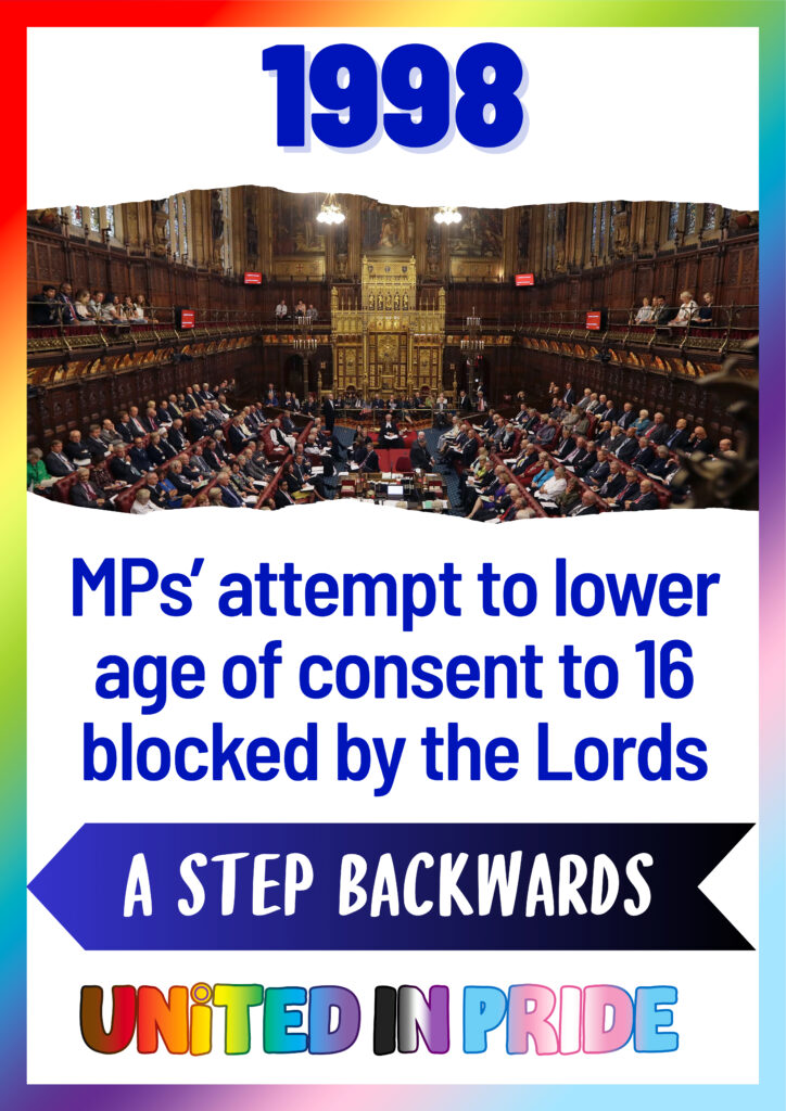 1998 MPs’ attempt to lower age of consent to 16 blocked by the Lords In 1998, a significant attempt was