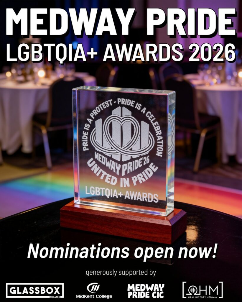 This year’s awards will light up The Glass Box Theatre at Mid Kent College in Gillingham this June — and we’re keeping the celebration going with a Medway Pride Fringe Festival event in August, giving even more space for local voices to shine.