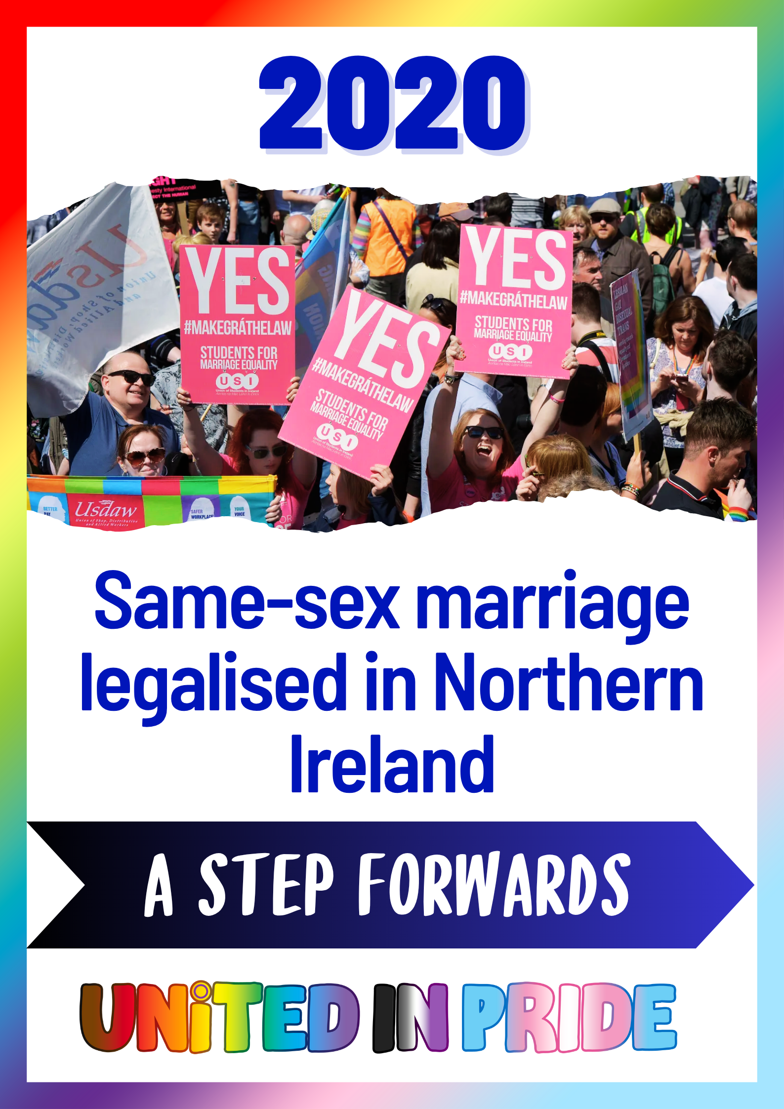 Same-sex marriage became legally recognised in Northern Ireland on 13 January 2020, following the Northern Ireland (Executive Formation etc) Act 2019. This legislation was passed by the UK Parliament in Westminster because the Northern Ireland Assembly at Stormont had been suspended since 2017 due to political deadlock.